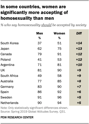 In most of the countries surveyed, there are no significant differences between men and women. However, for all 12 countries surveyed where there was significant difference, women were more likely to approve of homosexuality than men. South Korea shows the largest divide, with 51% of women and 37% of men saying homosexuality should be accepted by society.