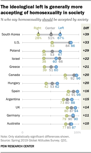 In South Korea, for example, those who classify themselves on the ideological left are more than twice as likely to say homosexuality is acceptable than those on the ideological right (a 39-percentage-point difference). Similar double-digit differences of this nature appear in many European and North American countries.
