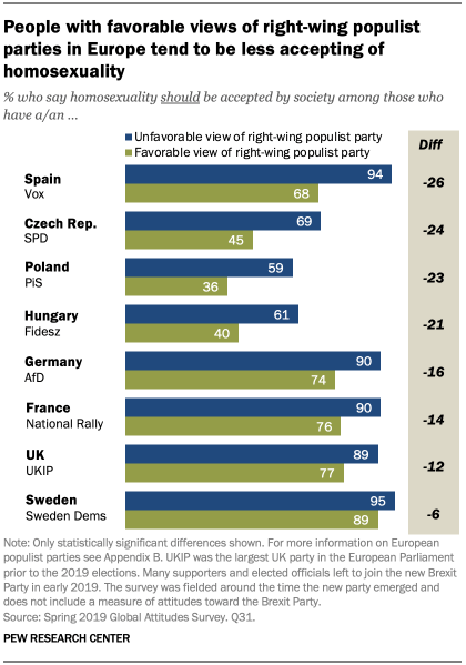 Similar differences appear in neighboring Hungary, where the ruling Fidesz party, led by Prime Minister Viktor Orbán, also has shown hostility to gay rights. But even in countries like France and Germany where acceptance of homosexuality is high, there are differences between supporters and non-supporters of key right-wing populist parties such as National Rally in France and Alternative for Germany (AfD).